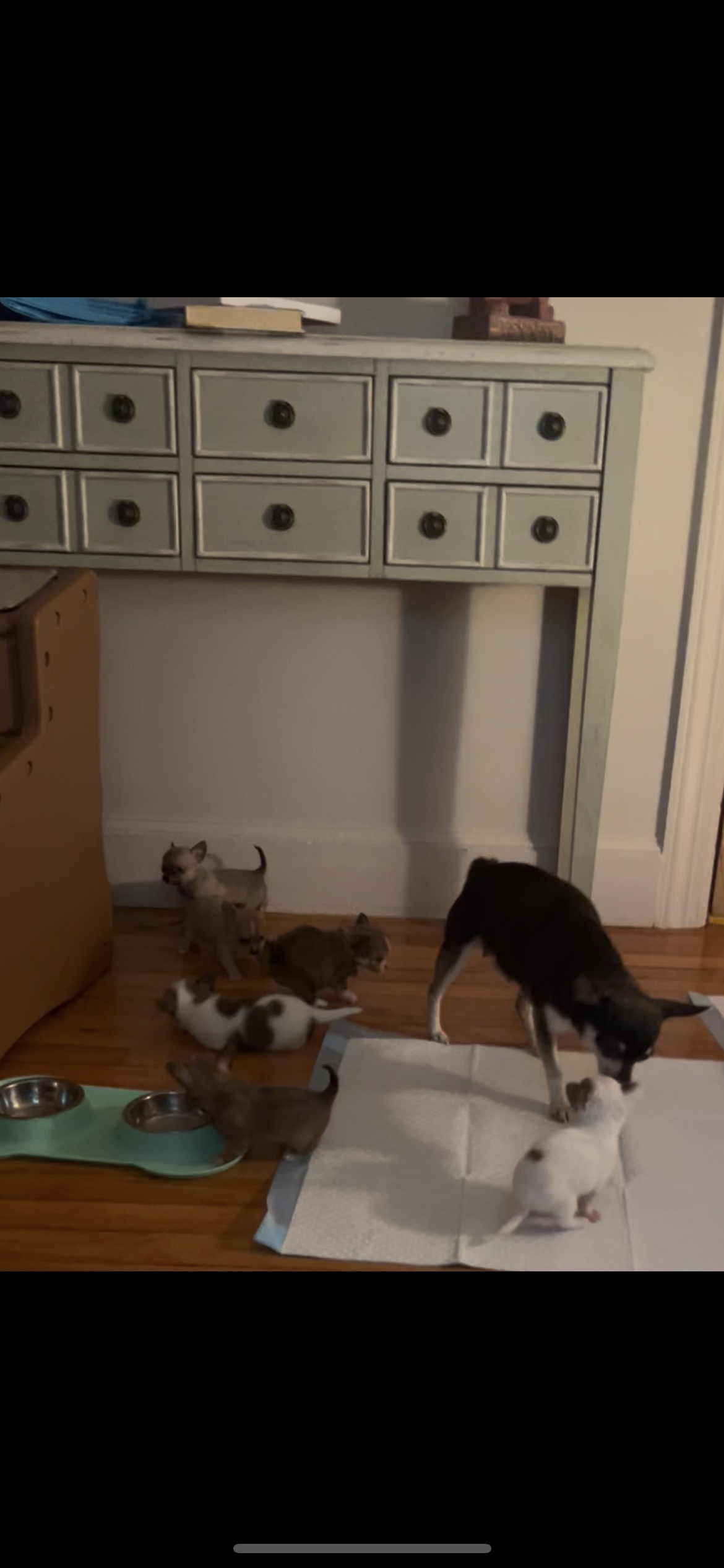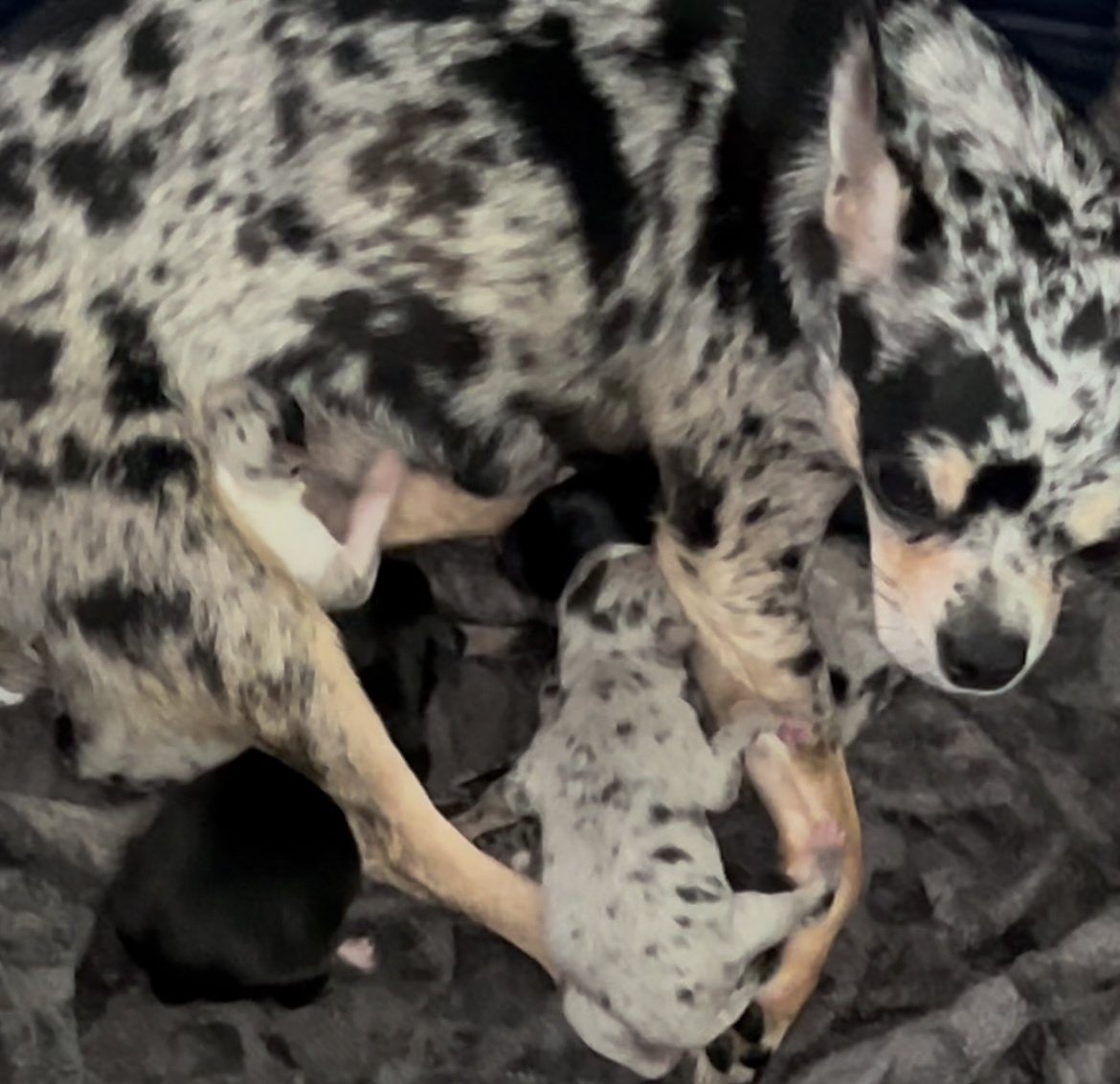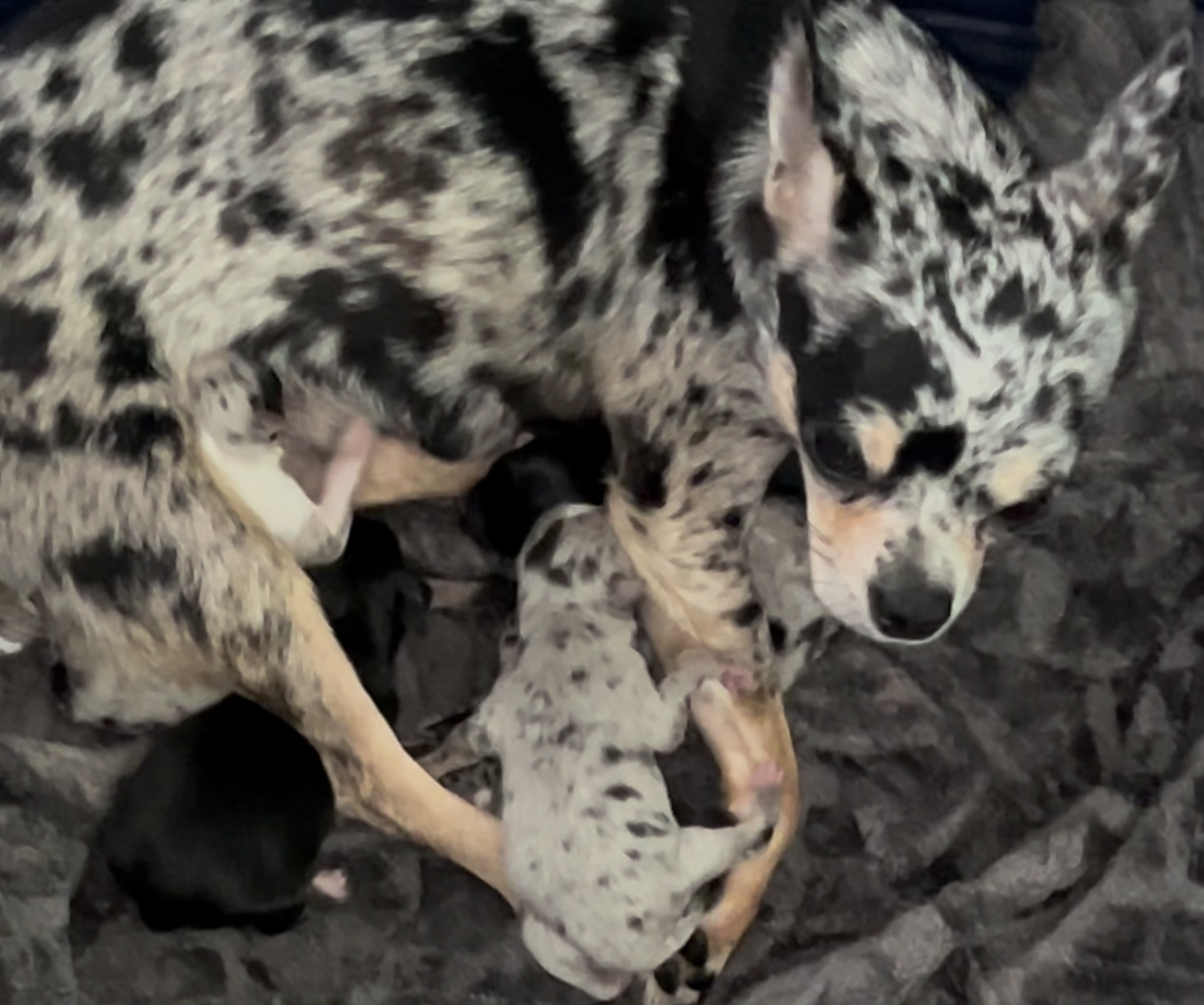 "November litter" ( 4 females, 1 male) - black merles, black with white marking